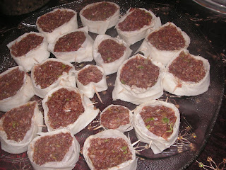 Darüzziyafe KöftesiMalzemeler 1,5 Kilo Köftelik Kıyma 2 Dilim Bayat Ekmek İçi 6 Dal Maydonoz 1 Tane Yumurta Yarım Çay Bardağı Şam Fıstığı İçi 1 Tane Büyük Kuru Soğan 1 Tatlı Kaşığı Karabiber 1 Tatlı Kaşığı Tuz 1 Tatlı Kaşığı Kırmızıbiber 1 Tatlı Kaşığı Kimyon 1 Adet Yufka Yapılışı:Köfteyi bildiğimiz şekilde hazırlayalım Fıstığınıda katın Yufkayı serin Köfteyi rulo yapın Yufkanın üzerine koyup saralım Birer parmak kalınlığında kesip kürdanla yufkayı tutturun Yağda iki tarafınıda kızartalım![]()