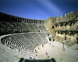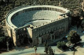 Antalya – Alanya karayoluna dönen yolun sonunda en görkemli, aynı zamanda işlevsel açıdan en iyi tasarlanmış ve en eksiksiz Roma tiyatrosu örneği ile karşılaşılır Yapı, Yunan geleneğine uygun olarak bir tepedeki bayıra yapılmıştır Günümüzde ziyaretçiler yapıya epey sonra inşa edilen ön cephedeki kapıdan girerler Aslında orijinal giriş, sahne binasının iki ucundaki tonozlu paradoslardandır